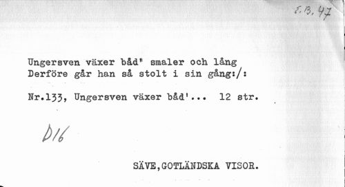 //// << '*> y/ //// Ungersven växer båd* småler och lång Derföre går han så stolt i sin gång:/: //// Nr.I33, Ungersven växer båd1... 12 str. //// « //// SAVE,GOTLÄNDSKA VISOR. //// ... ¦> v ////