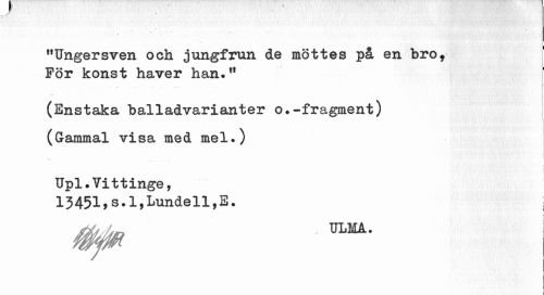 //// "Ungersven och jungfrun de möttes på en bro, För konst haver han»11 //// (Enstaka balladvarianter o.-fragment) (Gammal visa med mel.) //// i //// j //// Upl.Vittinge, 13451,s.l,Lundeli,E. //// -j //// i i ////