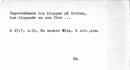 //// Ungerswännen han klappar på dörren, han klappade nu som förr ... //// i //// B 47*7> s.21, En wacker Wisa, 6 str.,kom. //// i i //// i //// I i //// i //// RA. ////