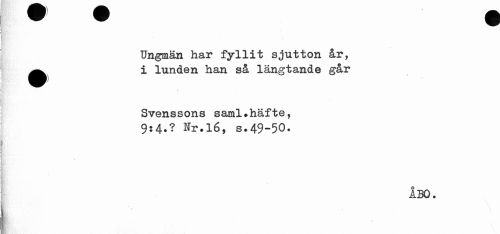 //// Ungmän har fyllit sjutton år, //// •i lunden han så längtande går //// ) //// Svenssons saml.häfte, //// 9:4.? Kr.16, s.49-50. //// ÅBO. //// / //// * ////