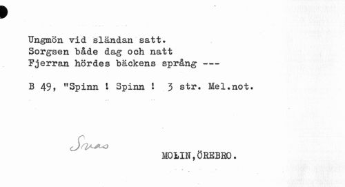 //// 1 //// Ungmön vid sländan satt. Sorgsen både dag och natt Fjerran hördes bäckens språng --- //// B 49, "Spinn i Spinn ! 3 str. Mel.not. //// MOLIN,ÖEEBRO. ////