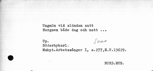//// Ungmön vid si ändan satt Sorgsen både dag och natt ... //// Up. j Söderbykarl. //// Mskpt»Arbetsgånger I, s.277,E.U*19629. //// ^ NORD.MUS. ////