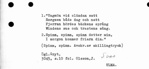 //// 1."Ungmön vid sländan satt Sorgsen både dag och natt ^^ Fjerran hördes bäckens språng //// Windens sus och trastens sång. //// 2.Spinn, spinn, spinn dotter min, I morgon kommer friarn din." //// (Spinn, spinn. Avskr.av skillingtryck) Ögl.Gryt, //// 3045, s.10 fol. Olsson,J. //// ULMÅ. ////