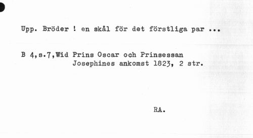 //// f //// Upp. Bröder 1 en skål för det förstliga par . •» //// B 4>s.7>Wid Prins Oscar och Prinsessan //// Josephines ankomst 1823* 2 str. //// RA. ////