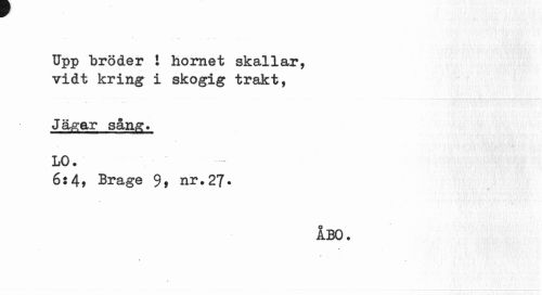 //// Upp bröder i hornet skallar, vidt kring i skogig trakt, //// Jagar sång» //// i //// LO. //// 6:4» Brage 9» nr.27* //// ÅBO. //// % ////