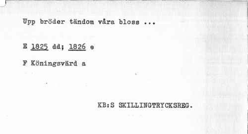 //// Upp bröder tändom våra bloss i //// E 1825 dds 1826 e //// ...um MW...' ---l-m -11--- //// P Köningsvärd a //// \ . //// • ; //// i //// KB:S SKILLINGTRYCKSREG. //// \ //// »¦ • i t ////