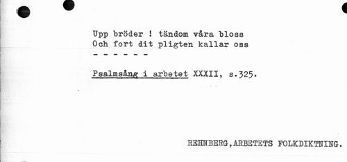 //// Upp bröder ! tändom våra bloss Och fort dit pligten kallar oss //// Psalmsång i arbetet XXXII, s.J25* //// « //// REHNBERG,ARBETETS FOLKDIKTNING. ////