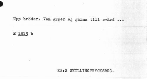 //// w //// ¦ //// Upp bröder. Vem grper ej gärna till svärd ... //// E 1815 b //// i //// KB:S SKILLINGTRYCKSREG. ////