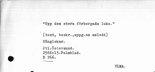 //// 1 //// % //// ¦ //// « //// "Upp den stora förborgade luka.M //// (text, beskr.,uppg.om melodi) Sånglekar. //// Jtl.Östersund. 2566:13.Palmblad. ^ D 266. //// ULMA. ////