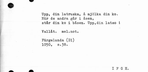 //// jjjj •• r' //// Upp, din latruska, å mjölka din ko. //// När de andra går i åsen, //// står din ko i båsen» Upp,din latso 1 //// j n //// Vallåt. mel.not. Färgelanda (Dl) //// 1050, s.38. //// I F G H. ////