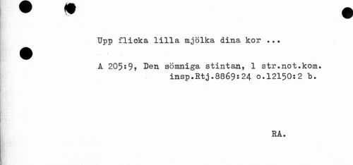 //// w W £ //// Upp flicka lilla mjölka dina kor ... //// A 205:9» sömniga stintan, 1 str.not.kom. //// insp.Btj.8869:24 o.12150:2 b. //// RA. ////