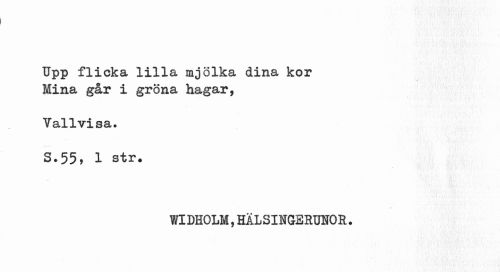 //// Upp flicka lilla mjölka dina kor lina går i gröna hagar, //// Vallvisa. //// S.55> 1 str. //// * //// WIDHOLM, HÄLSINGERMOS. ////
