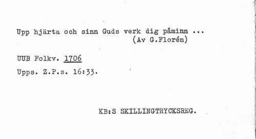 //// Upp hjärta och sinn Guds verk dig påminn ... //// (Av //// G.Floren) ! //// i //// UUB Folkv. 1706 J //// Upps. Z.P.s. 16:33. 7 f //// KB:S SKILLINGTRYCKSREG. //// 1 ////