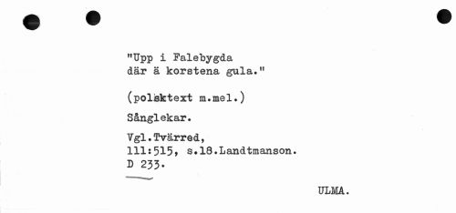 //// "Upp i Falebygda där ä korstena gula." //// (polisktext m.mel.) Sånglekar. //// Ygl.Tvärred, //// 111:515> s#18.Landtmanson. //// D 233* //// ULMA- ////