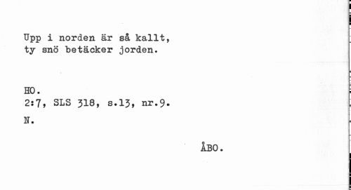 //// Upp i norden är så kallt, ty snö betäcker jorden. //// HO. i //// 2:7, SLS 318, s.13, nr.9. //// H. //// ÅBO. ^ ////