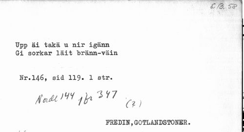 //// Upp äi takä u nir igänn | //// Gi sorkar läit bränn-väin //// Hr.146, sid 119* 1 str. //// /tai^ik™ c?, //// PREDIN, GOTLAHDSTONER. | //// 4 / E ////