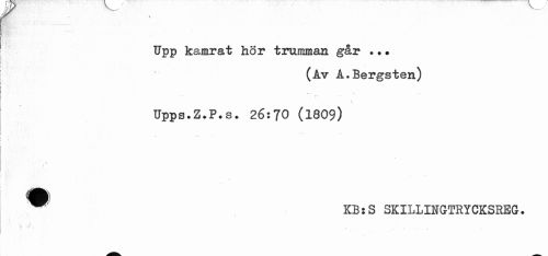 //// w //// Upp kamrat hor trumman går .?• //// (Av A.Bergsten) //// Upps.Z.P.s. 26:70 (1809) //// ¦s //// KB:S SKILLINGTRYCKSREG. //// ! ////