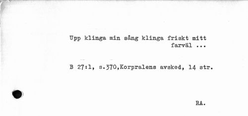 //// Upp klinga min sång klinga friskt mitt //// farväl .•. //// B 27^1» s.370,Korpralens avsked, 14 str. ^ RÅ. ////