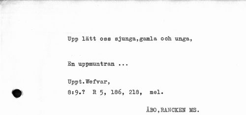 //// Upp lätt oss sjunga,gamla och unga, //// En uppmuntran //// Uppt.Wefvar, Wk) 8:9.? R 5, 186, 218, mel. //// ÅBO,RANCKEN MS. ////