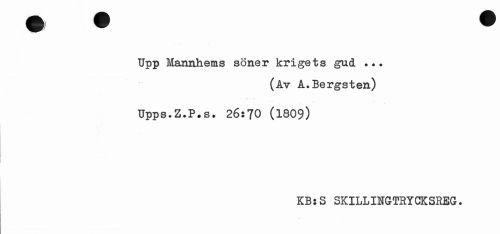 //// Upp Mannhems söner krigets gud ... //// (åt A.Bergsten) //// Upps.Z.P.s. 26:70 (1809) //// KB:S SKILLINGTRYCKSREG. ////