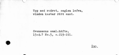 //// Upp med rodret, seglen lefva, //// vinden kastar rätt emot. //// ? • //// Svenssons saml.häfte, 15:4.? Hr.5, s.219-221. //// ÅBO. ////