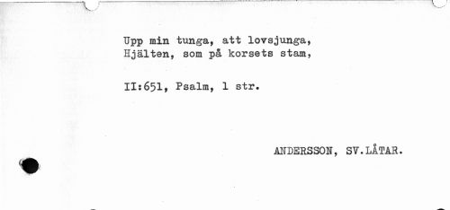 //// Upp min tunga, att lovsjunga, Hjälten, som på korsets stam, //// 11:651, Psalm, 1 str. //// ANDERSSON, ST.LÅTAR. ////