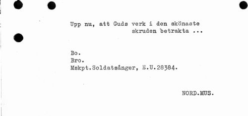 //// Upp nu, att (Juds verk i den skönaste ^^ skruden "betrakta ... //// Bo. Bro. //// Mskpt.Soldatsånger, E.U.28384» //// % //// NORD.MUS. ////