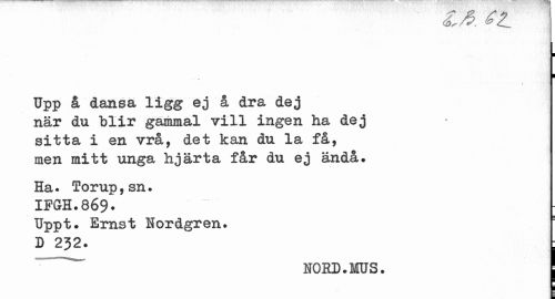 //// ; //// 4 //// Upp å dansa ligg ej å dra dej när du blir gammal vill ingen ha dej sitta i en vrå, det kan du la få, men mitt unga hjärta får du ej ändå. //// Ha. Torup,sn. //// IFGH.869* //// Uppt. Ernst Nordgren. //// D 232. : //// NOHD.MUS. ! ////