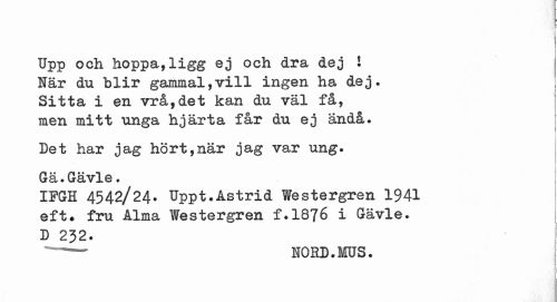 //// I //// Upp och hoppa,ligg ej och dra dej ! När du blir gammal,vill ingen ha dej. Sitta i en vrå,det kan^du väl få, men mitt unga hjärta får du ej ändå. //// Det har jag hört,när jag var ung. //// j //// Gä.Gävle. //// IFGH 4542/24. Uppt.Astrid Westergren 1941 //// eft* fru Alma Westergren f.1876 i Gävle. //// D 232. ! //// ---' NORD. MUS. //// l 1 ////