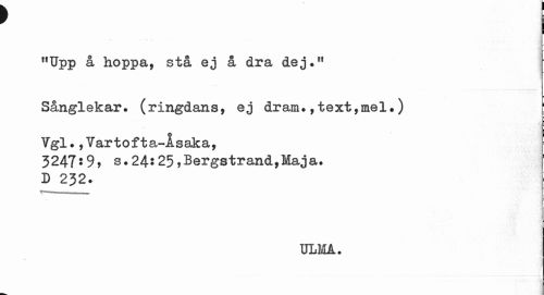 //// "Upp å hoppa, stå ej å dra dej." Sånglekar, (ringdans, ej dram. ,text,mel.) //// t ¦ //// Vgl., Yartofta,-isaka, //// 5247:9, s.24*25»Bergstrand,Maja. //// D 232. //// t- I //// ULMA. ////