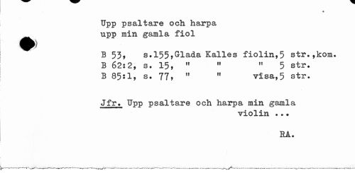 //// Upp psaltare och harpa ^^ upp min gamla fiol //// B 53> s.155,Glada Kalles fiolin,5 str.,konu B 62:2, a. 15, " ,f " 5 str» //// B 85:1, s. 77, 11 11 visa,5 str. //// Jfr. Upp psaltare och harpa min gamla //// violin ... //// HA # ////