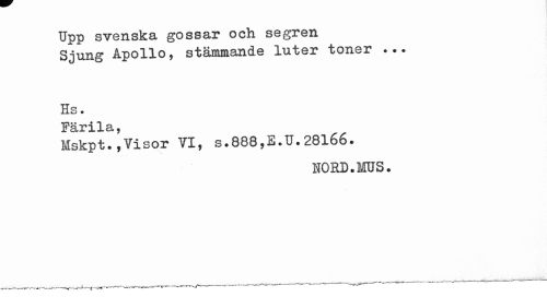 //// Upp svenska gossar och segren //// Sjung Apollo, stämmande luter toner ... //// Hs. //// Färila, //// Mskpt.,Visor VI, s.888,E.U.28166. //// NORD.MUS. ////