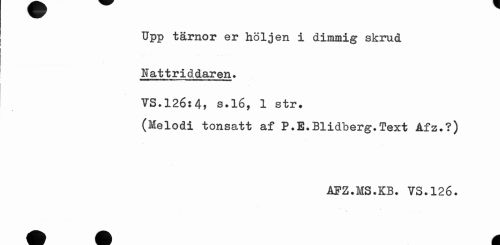 //// Upp tärnor er höljen i dimmig skrud Nattriddaren. //// VS.126:4, s.16, 1 str, //// (Melodi tonsatt af P.E.Blidberg.Text Afz.?) //// ÅFZ.MS.KB. VS.126. ////