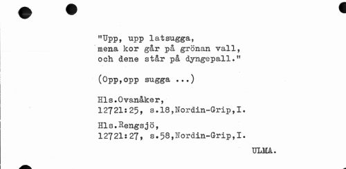 //// "Upp, upp latsugga, //// mena kor går på grönan vall, //// ooh dene står på dyngepall." //// (Opp,opp sugga ..„) //// Hls.Ovanåker, //// 12721:25, s.18,Nordin-Grip,I. //// Hls.Rengsjö, //// 12721:27, s.58,Nordin-Grip,I. //// ULEå. ////