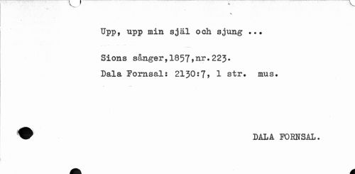 //// v //// Upp* upp min själ och sjung . //// Sions sånger,1857,nr#223* //// Dala Fornsal: 2130:7, 1 str. mus. ^ DÅLÅ FORNSAL. //// A M ////