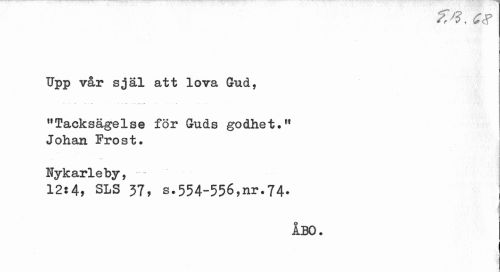 //// Cg //// Upp vår själ att lova Gud, //// "Tacksägelse för Guds godhet." Johan Frost. //// Nykarleby, - //// 12:4, SLS 37, s.554-556,nr.74. //// ÅBO. ////