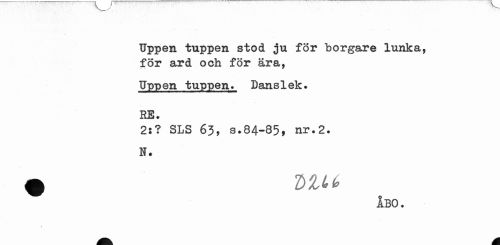 //// Uppen tuppen stod ju for "borgare lunka, för ard och för ära, //// Uppen tuppen. Danslek. RE. //// 2s? SLS 63, s.84-85, nr.2. N. //// « l)ZU //// ÅBO. ////