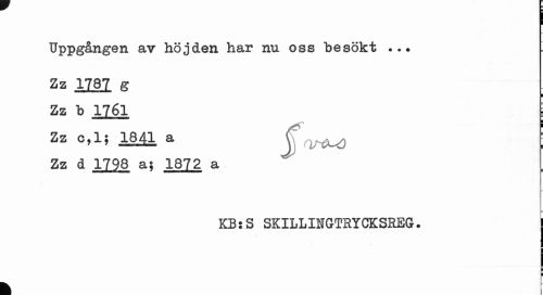 //// Uppgången av höjden har nu oss besökt ... //// Zz 1787 g //// i //// Zz b 1761 i //// Zz c,l; 1841 a C \ //// Zz d 1798 a; 1872 a //// KBsS SKILLINGTBYCKSREG. //// k ////