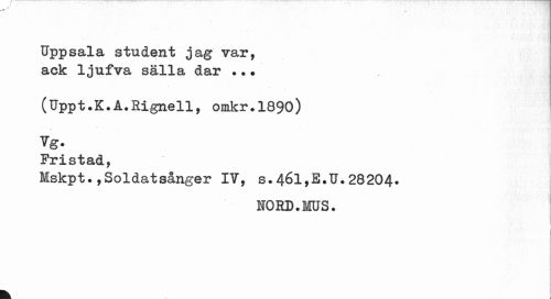 //// Uppsala student jag var, ack 1jufva sälla dar ..• //// (Uppt.K.A.Rignell, omkr.1890) //// Vg. //// Fristad, //// Mskpt.,Soldatsånger IV, s.46l,E.U.28204. //// NORD.MUS. ////