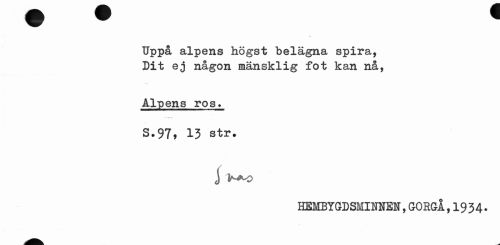 //// » //// Uppå alpens högst belägna spira, Dit ej någon mänsklig fot kan nå, //// Alpens ros* S.97, 13 str. //// J l^o //// HEMBYGD SMIOTFEN,GOHGÅ,19 3 4. ////