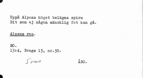 //// Uppå Alpens högst belägna spira Dit som ej någon mänsklig fot kan gå. //// Alpens ros. //// SO. //// 13:4, Brage 13, nr.30. //// J ABQ. //// " //// k I ////