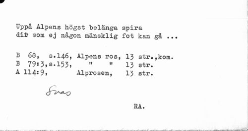 //// Uppå Alpens högst belänga spira //// dit som ej någon mänsklig fot kan gå .. ? //// B 68, s.146, Alpens ros, 13 str*,kom. B 79:3,s.153, » « 13 str. A 114:9, Alprosen, 13 str. //// c //// EA. //// ___ .. ^___--- fWW.-rli,-V n liii »Mi'ff M^J ////