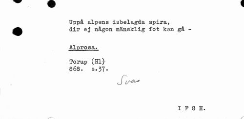 //// TJppå alpens isbelagda spira //// Dit ej någon mensklig fot kan nå . . . //// Alprosa. //// Torup (Hl) 868. s.37. //// Slf*" //// I F G H. ////