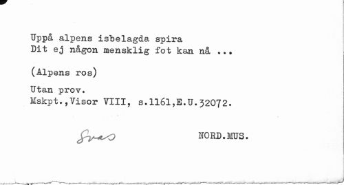 //// TJppå alpens isbelagda spira //// Dit ej någon mensklig fot kan nå . . . //// (Alpens ros) Utan prov. //// Mskpt.,Visor VIII, s.ll6l,E.U.32072. //// s^sO NORD. MUS. //// ^ ___;i u ... ...,J ////