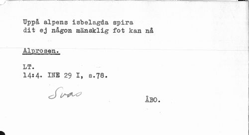 //// TJppå alpens isbelagda spira //// Dit ej någon mensklig fot kan nå . . . //// Alprosen* ~ //// LT. //// 14:4- UTE 29 I, b.78. //// V //// J^ ÅBO. ////