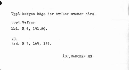 //// t //// Uppå bergen höga der hvilar stenar hård, //// ...' I //// Uppt.Wefvar. ! //// Mel. R 6, 191,80. //// 4 //// vö. //// 4:4, B 3, 165, 138. //// ÅBO,HÅICKEN MS. //// ¦ ////