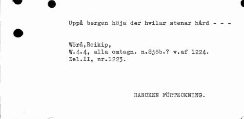 //// Uppå bergen höja der hvilar stenar hård - - -Worå,Reikip, //// W.4*4, alla omtagn. n*Sjöb.? v,af 1224* Del.II, nr,1223. //// RA1CKEN FÖRTECKNIUÖ. //// S' ////
