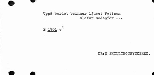 //// Uppå "bordet brinner ljuset Pettson //// slafar nedanför ... //// E 1901 e4 //// KB:S SKILLINGTRYCKSREG. ////