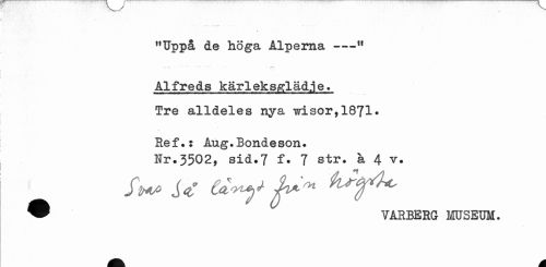 //// HTIppå de höga Alperna---11 //// Alfreds kärleksglädje* Tre alldeles nya wisor,1871» //// Ref.: Aug.Bondeson. //// Nr.3502, sid.7 f. 7 str. a 4 v. //// JW u e*^ ^ //// ® ° YARBERG MUSEUM. //// a a ////