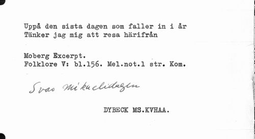 //// Uppå den sista dagen som faller in i år //// Tänker jag mig att resa härifrån //// Moberg Excerpt. //// Folklore 7: bl.156. Mel.not.1 str. Kom. [ //// fi^o otät*, c^^y^- I //// DYBECK MS.KVHAA. //// t ////
